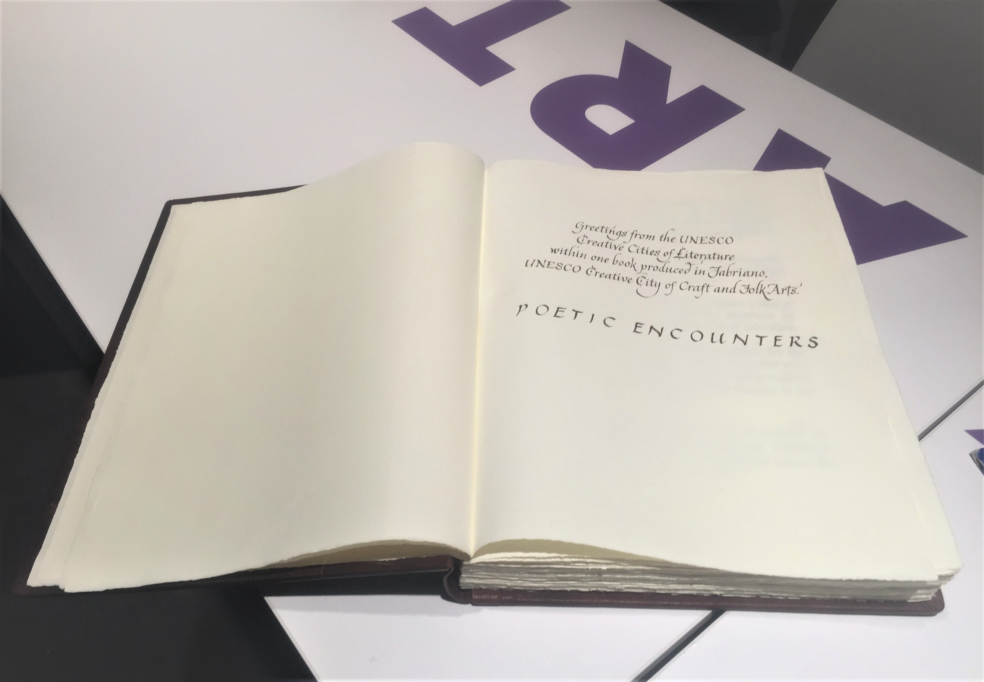 51 poets from 27 UNESCO Cities of Literature have come together to celebrate the collaborative spirit which lies at the core of the UCCN and to support linguistic diversity through poetic expressions from around the world. The book is dedicated to all people worldwide valuing the power and richness of literature and advocating freedom of thought and speech. All texts were written or printed on beautiful handcrafted, folio-sized paper from Fabriano UNESCO City of Crafts and Folk Art. The paper was sent from Fabriano via Heidelberg to all UNESCO Cities of Literature worldwide and, after being filled with literary works, was sent all the way back to Fabriano where the unique book was bound.