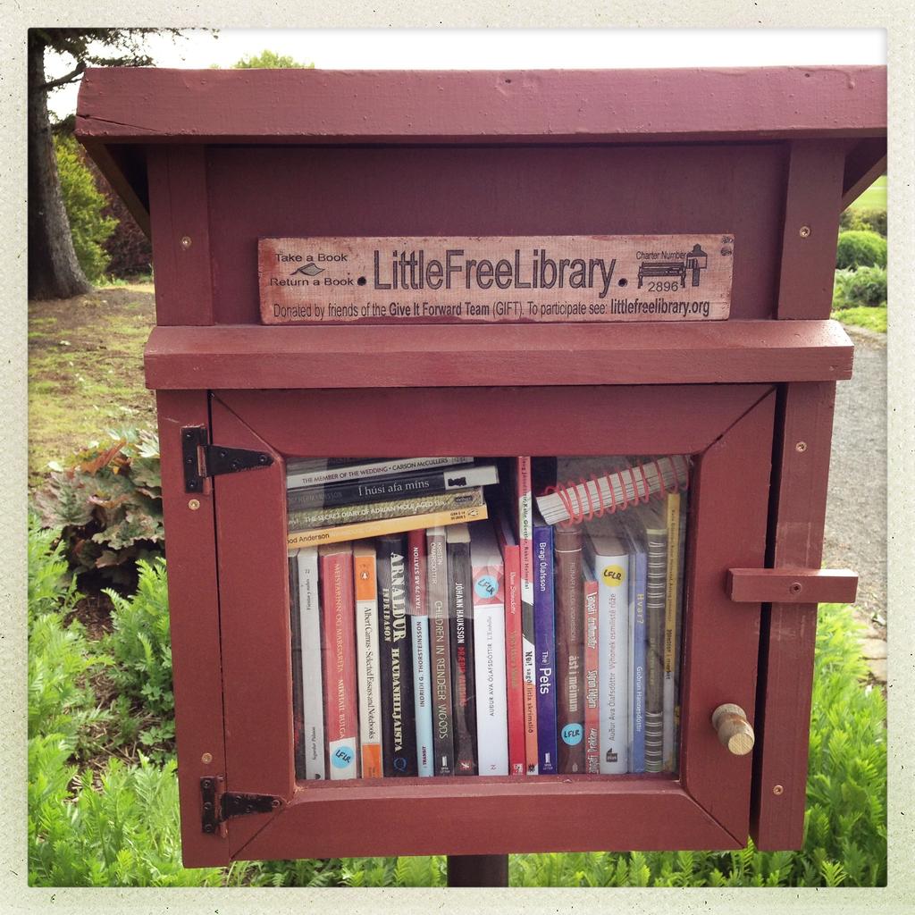 Little Free Library samtökunum í Bandaríkjunum. Þetta er fallegur lítill kassi sem sver sig í ætt við húsastíl Amish-fólksins. Hann mun verja þær bækur sem verða til útláns hverju sinni fyrir reykvísku veðri og vindum. Þess ber að geta að í smíðina var notast við endurnýttan við sem fenginn var úr gamalli amerískri hlöðu sem skýstrókur feykti um koll fyrir tæplega einni öld.