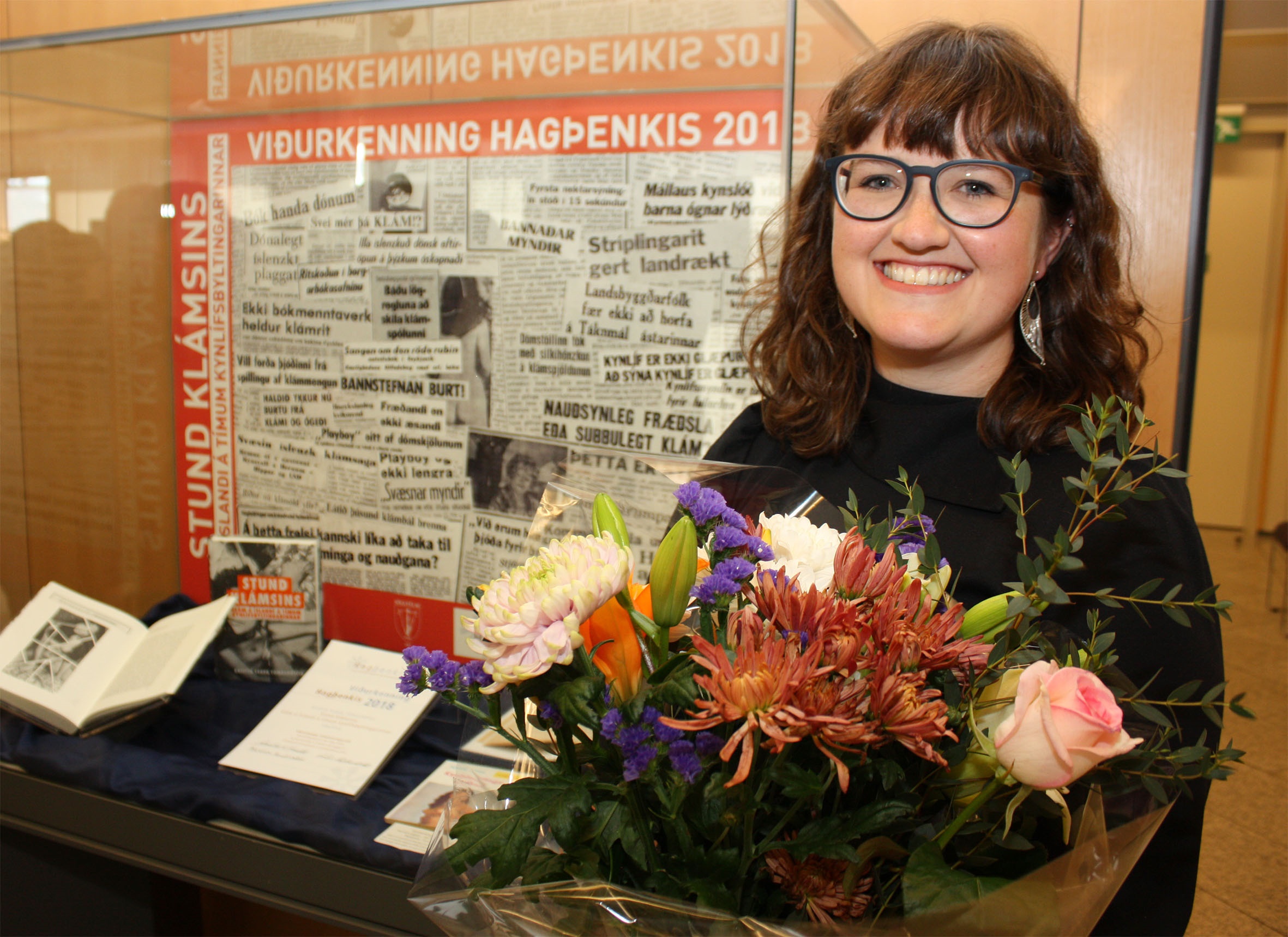 Stund klámsins er byggð á meistararitgerðinni minni í sagnfræði, og þótt liðið sé á fimmta ár frá því ég útskrifaðist frá Háskóla Íslands líður mér dálítið eins og bókin sé sveinsstykkið mitt sem sagnfræðingur, endapunkturinn á löngu og ánægjulegu þjálfunartímabili. Á því tímabili naut ég stuðnings og leiðsagnar margra, frá skjalavörðum og safnafólki til vina og vandamanna, og ekki síður allra minna frábæru sögu- og sagnfræðikennara sem eiga ekki minnstan þátt í því að ég skuli standa hér í dag. Alveg frá því í grunnskóla hef ég setið í tímum hjá herskara metnaðarfullra sagnfræðinga, fólki sem miðlaði þekkingu sinni á sögunni og faginu af ástríðu og gleði, vakti áhuga á og virðingu fyrir greininni, leiðbeindi og gagnrýndi en treysti nemendum sínum jafnframt til að standa á eigin fótum. Hér verður að nefna sérstaklega Ragnheiði Kristjánsdóttur, sem leiðbeindi mér við skrif meistararitgerðarinnar, átti hugmyndina að því að koma henni út á bók og kom mér í samband við Sögufélag – þar sem margir góðir kennarar voru líka innanbúðar – og þar sem allir lögðust á eitt við að gera bókina sem best úr garði, bæði að inntaki og útliti. Um leið og ég þakka viðurkenningaráði Hagþenkis fyrir þennan mikla heiður langar mig að tileinka viðurkenninguna öllum sögukennurunum mínum, með innilegu þakklæti fyrir uppeldið."